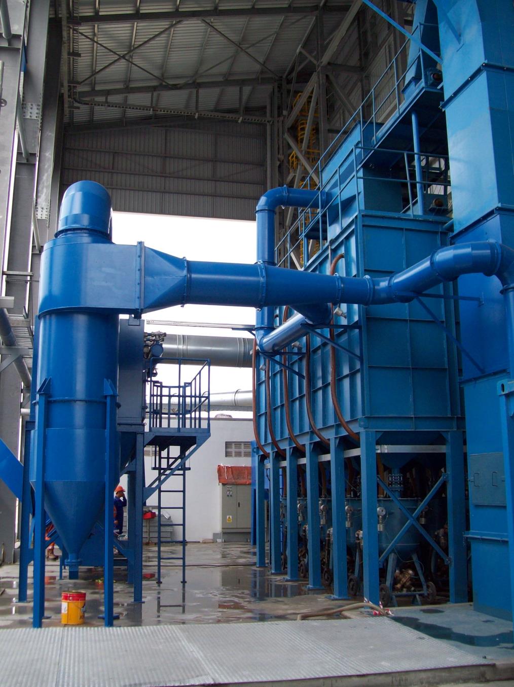 噴砂房左右兩側各配有一臺電動工作小車,方便操作員噴砂作業,整個噴砂房內襯耐磨損、降噪音的橡膠襯板,兩套濾筒式除塵器用于整個噴砂房的通風與除塵,粉塵含量小于60mg/m3。一套自動丸料風選和篩選裝置可將過大或過小的廢料從介質中分選出來,落入現場的回收廢料儲料斗,配有自動丸料風選振動篩。同時提供作業員保護裝置,包括操作人員保護頭盔、連體防砂衣和噴砂手套、呼吸過濾器和呼吸調溫器,最大限度地保障操作人員安全、健康的工作環境。