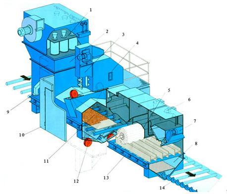 鋼材連續(xù)運(yùn)行到室內(nèi)彈丸拋射區(qū)時(shí),周圍各個(gè)面都受到不同方位的連續(xù)均勻拋射清理。