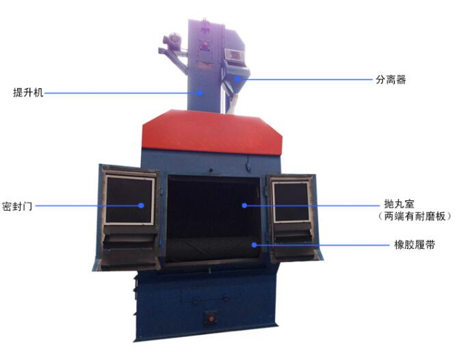 工作原理:在清理室中加入規(guī)定數(shù)量的工件,機器啟動后,工件被滾筒帶動,開始翻轉(zhuǎn)。同時拋丸器高速拋出的彈丸形成的彈束,均勻地打擊在工件表面上,從而達到清理的目的。拋出的彈九及砂粒經(jīng)橡膠履帶上的小孔流入底部的鋼板網(wǎng)過篩,經(jīng)螺旋輸送器送入提升機內(nèi),由提升機提到分離器中進行分離。粉塵由風(fēng)機吸送到除塵器中過濾,清潔空氣排入大氣中,布袋上的灰塵經(jīng)機械振打,落入除塵器底部的集塵箱中,用戶可定期清除,廢砂由廢料管流出,用戶可回收利用。丸砂混合物由回用管回收進入室體,待分離器分離后再回用干凈的彈丸由供丸閘門進入拋丸器拋打工件。